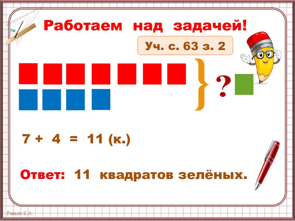 Уч. с. 63 з. 2 Ответ: 11 квадратов зелёных. 7 + 4 = 11 (к.)