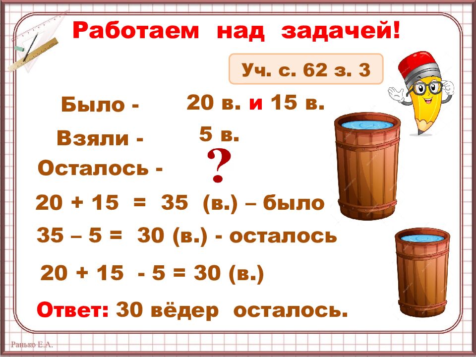 Уч. с. 62 з. 3 Было - Взяли - Ответ: 30 вёдер осталось. 20 + 15 = 35 ( в.) – было 35 – 5 = 30 ( в.) - осталось 20 + 15 - 5 = 30 ( в.) Осталось - 20 в. и 15 в. 5 в.