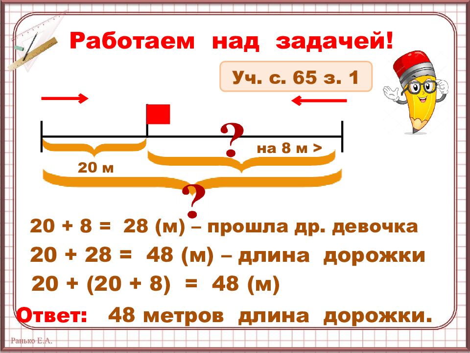 Уч. с. 65 з. 1 Ответ: 48 метров длина дорожки. 2 0 + 8 = 28 ( м ) – прошла др. девочка 20 м н а 8 м > 2 0 + 28 = 48 ( м ) – длина дорожки 2 0 + (20 + 8) = 48 ( м )