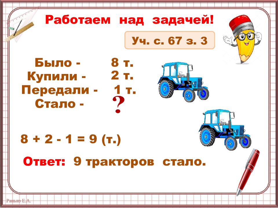 Уч. с. 67 з. 3 Ответ: 9 тракторов стало. Было - Купили - Передали - 8 т. 2 т. 8 + 2 - 1 = 9 (т.) 1 т. Стало -
