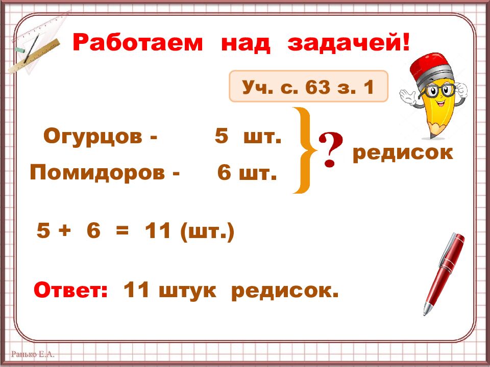 Уч. с. 63 з. 1 Огурцов - Помидоров - 5 шт. 6 шт. Ответ: 11 штук редисок. 5 + 6 = 11 (шт.) редисок
