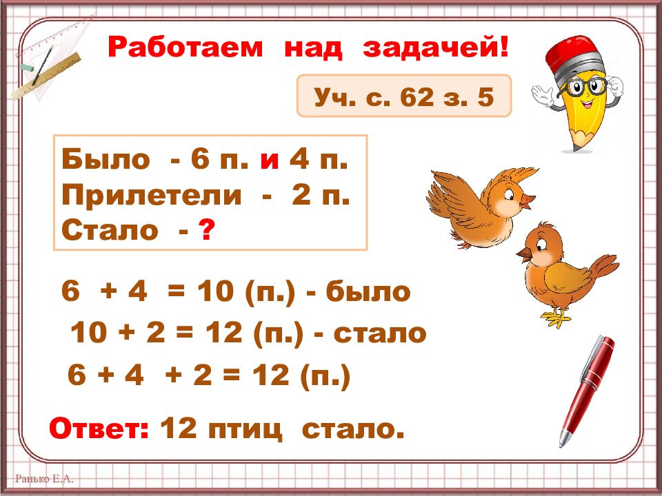 Уч. с. 62 з. 5 Ответ: 12 птиц стало. 6 + 4 = 10 (п.) - было Было - 6 п. и 4 п. Прилетели - 2 п. Стало - ? 10 + 2 = 12 (п.) - стало 6 + 4 + 2 = 12 (п.)