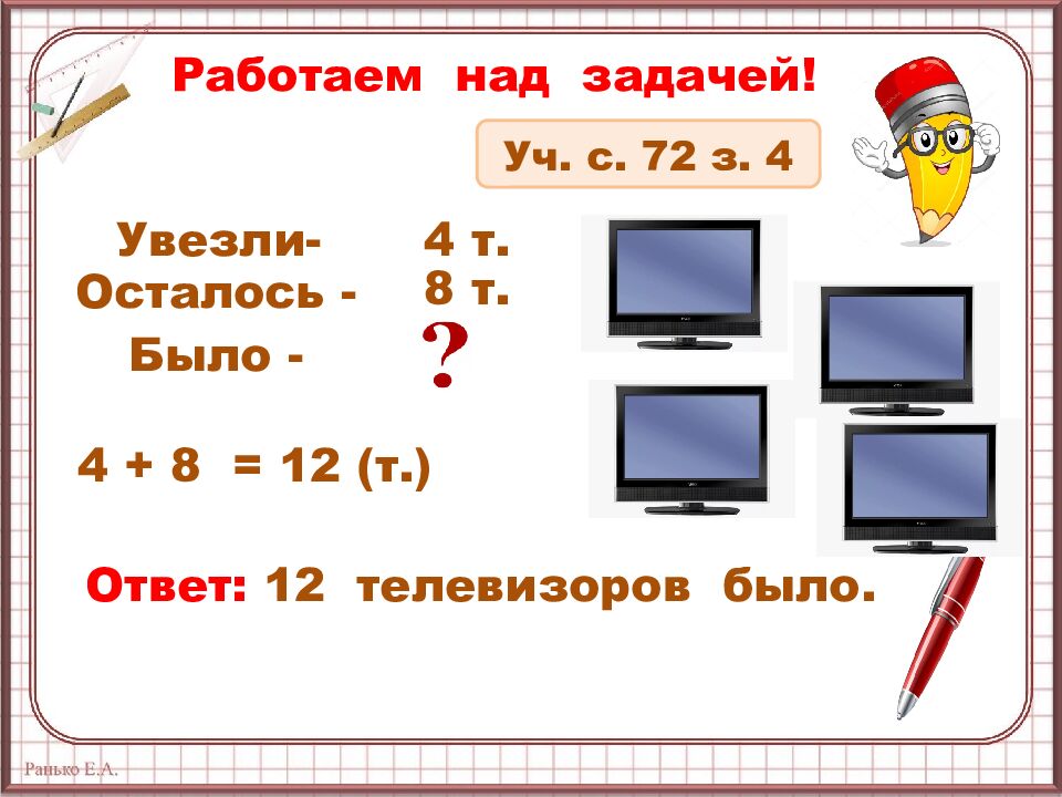 Уч. с. 72 з. 4 Ответ: 12 телевизоров бы ло. У везли- Осталось - 4 т. 8 т. 4 + 8 = 12 (т.) Бы ло -