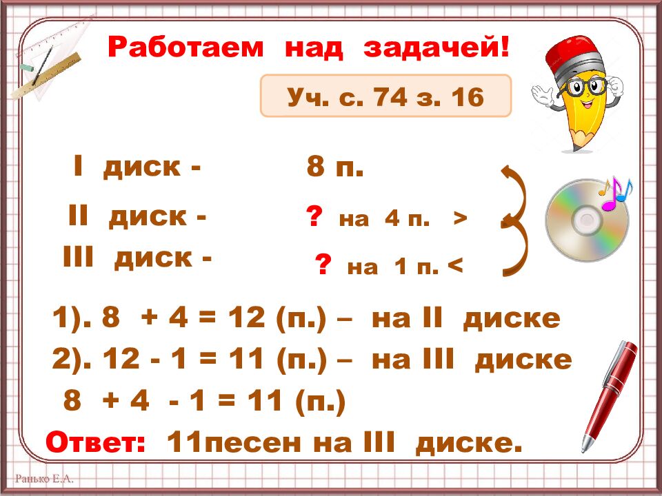 Уч. с. 74 з. 16 I диск - II диск - II I диск - 8 п. ? на 4 п. > ? на 1 п. < 1 ). 8 + 4 = 12 ( п.) – на II диске 2 ). 12 - 1 = 11 ( п.) – на III диске 8 + 4 - 1 = 11 ( п.) Ответ: 1 1песен на III диске.