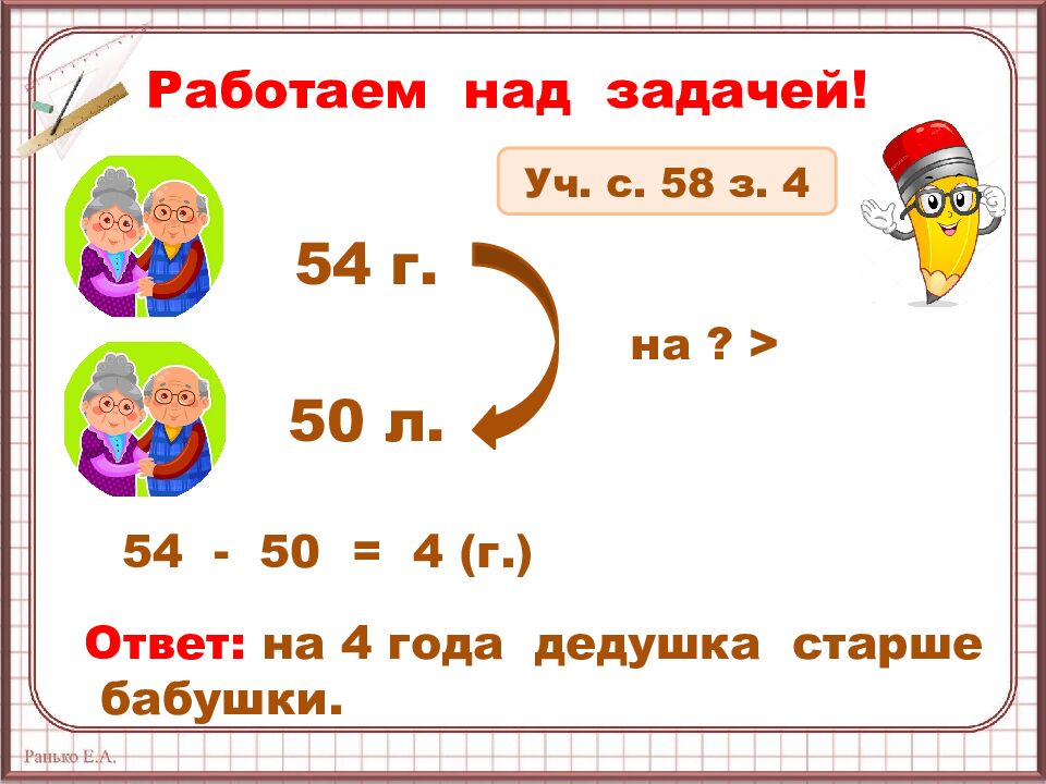 Уч. с. 58 з. 4 54 г. 50 л. на ? > 54 - 50 = 4 (г.) Ответ: на 4 года дедушка старше бабушки.
