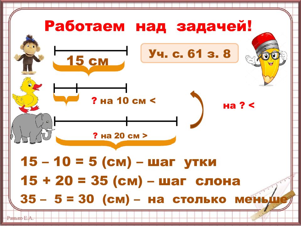 Уч. с. 61 з. 8 15 см ? на 10 см < ? на 20 см > 15 – 10 = 5 (см) – шаг утки 15 + 20 = 35 (см) – шаг слона н а ? < 35 – 5 = 30 (см) – на столько меньше