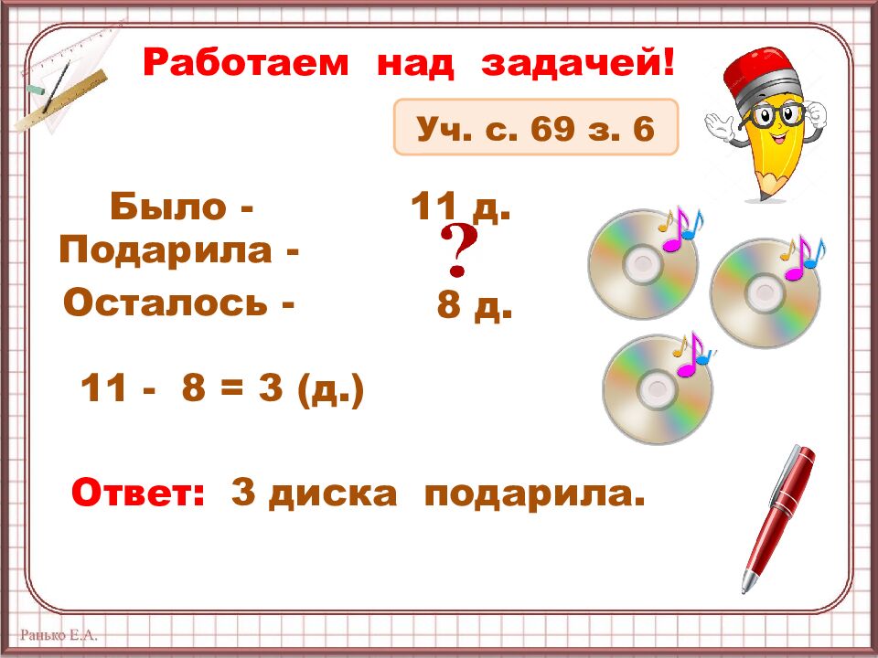 Уч. с. 69 з. 6 Ответ: 3 диска подарила. Было - Подарила - Осталось - 11 д. 11 - 8 = 3 (д.) 8 д.