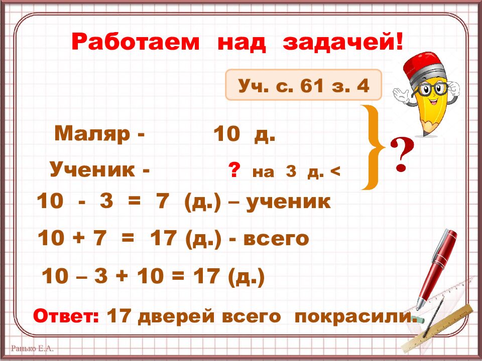 Уч. с. 61 з. 4 Маляр - Ученик - 10 д. ? на 3 д. < Ответ: 17 дверей всего покрасили. 10 - 3 = 7 (д.) – ученик 10 + 7 = 17 (д.) - всего 10 – 3 + 10 = 17 (д.)