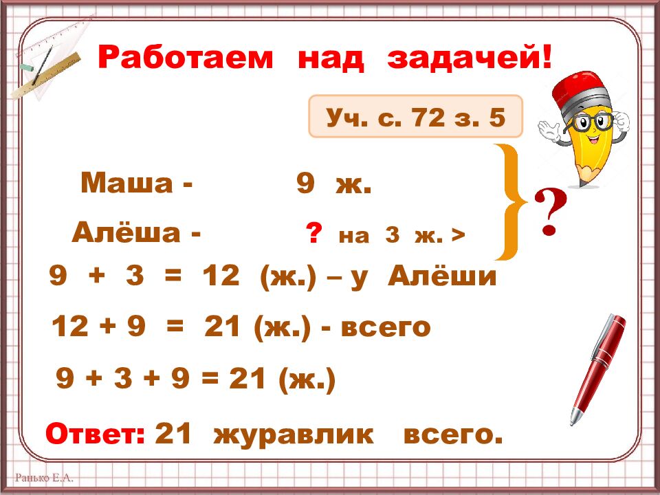 Уч. с. 72 з. 5 Маша - Алёша - 9 ж. ? на 3 ж. > Ответ: 21 журавлик всего. 9 + 3 = 12 (ж.) – у Алёши 12 + 9 = 21 (ж.) - всего 9 + 3 + 9 = 21 (ж.)