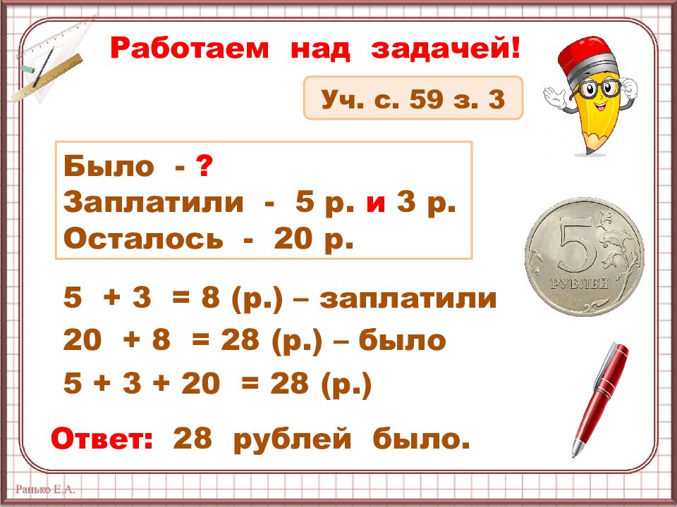 Уч. с. 59 з. 3 Ответ: 28 рублей было. 5 + 3 = 8 ( р.) – заплатили Было - ? Заплати ли - 5 р. и 3 р. Осталось - 20 р. 20 + 8 = 28 ( р.) – было 5 + 3 + 20 = 28 ( р.)