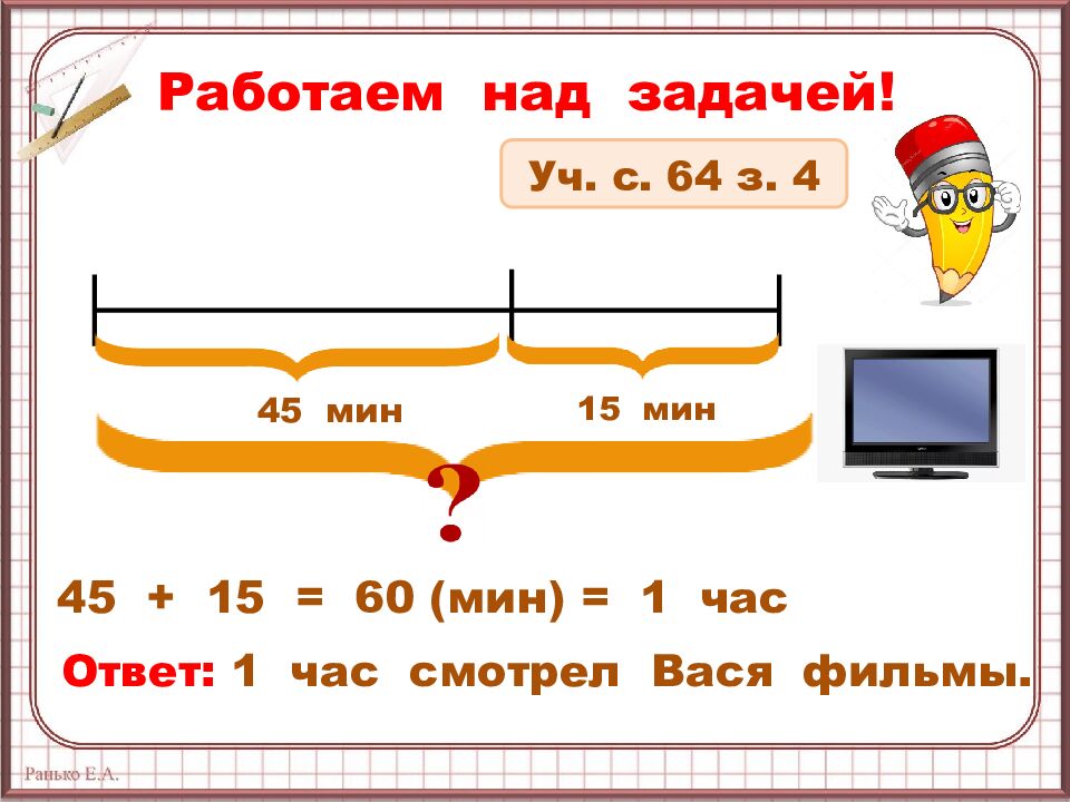 Уч. с. 64 з. 4 Ответ: 1 час смотрел Вася фильмы. 45 + 15 = 60 (мин) = 1 час 45 мин 1 5 мин