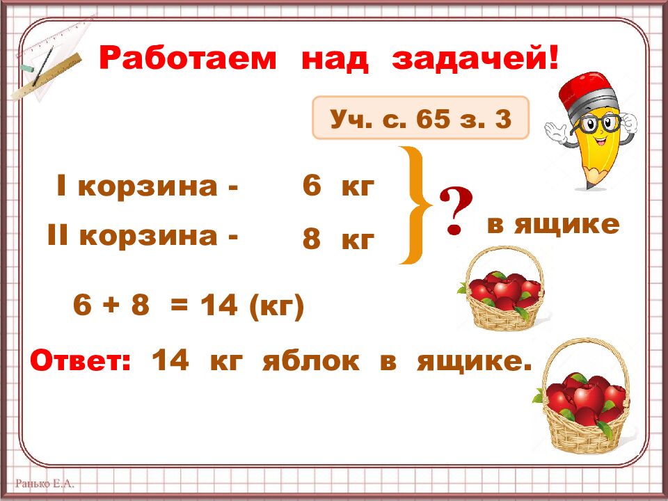 Уч. с. 65 з. 3 I корзина - II корзина - 6 кг Ответ: 14 кг яблок в ящике. 6 + 8 = 14 (кг) 8 кг в ящике