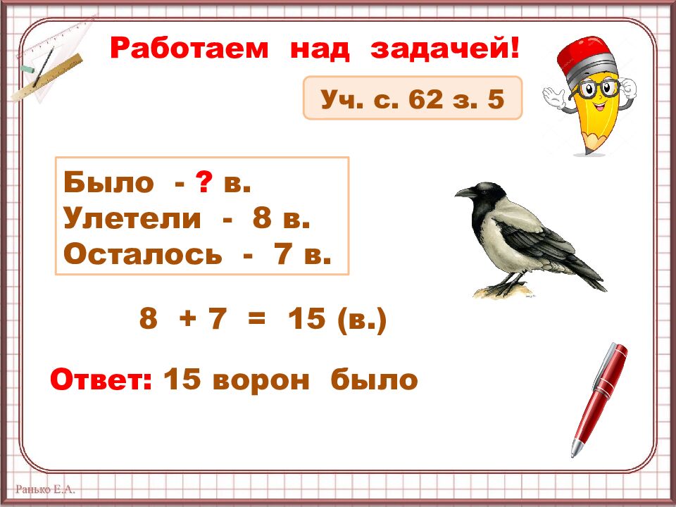 Уч. с. 62 з. 5 Ответ: 15 ворон было 8 + 7 = 15 ( в.) Было - ? в. Улетели - 8 в. Осталось - 7 в.