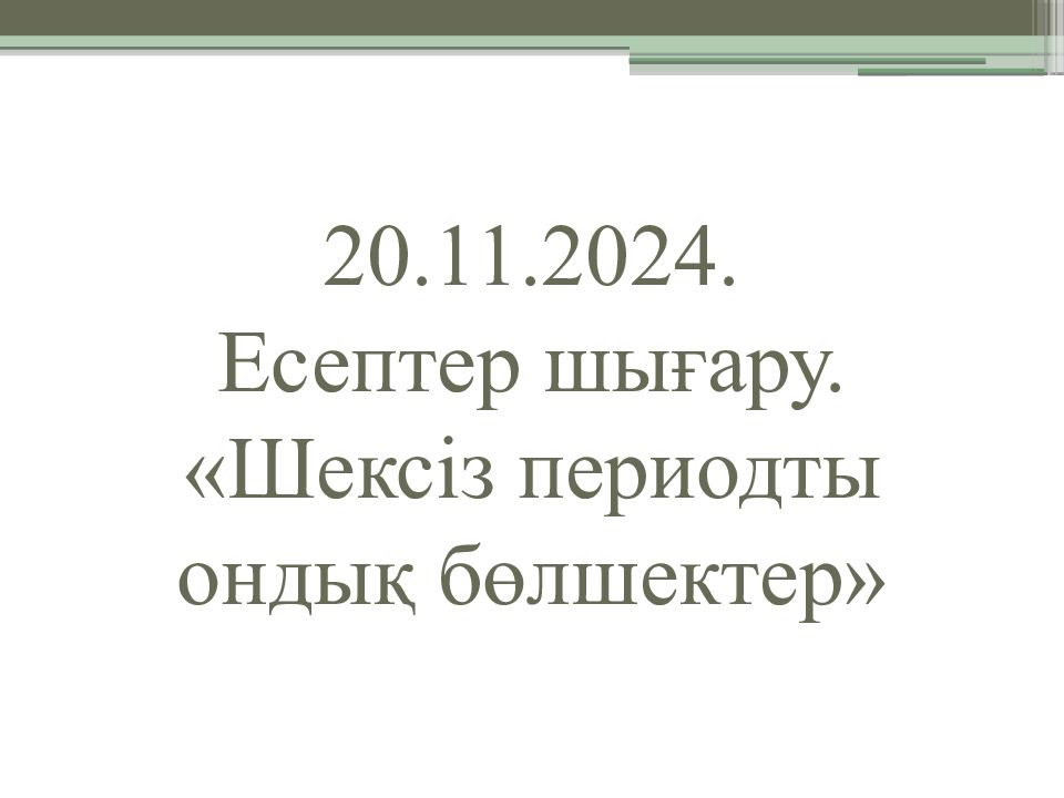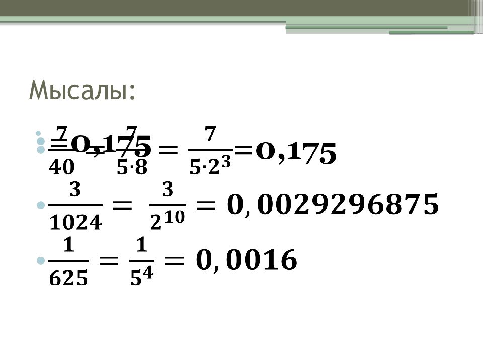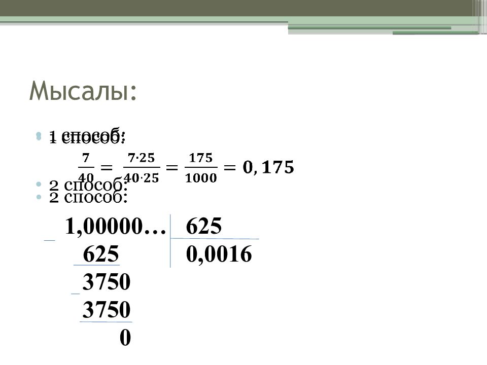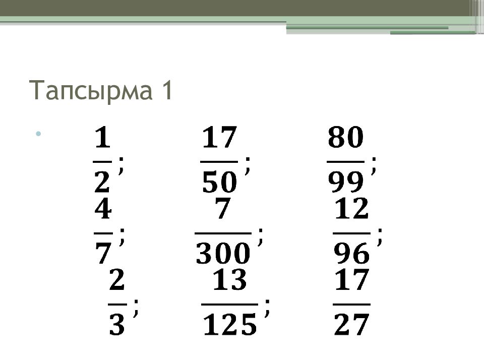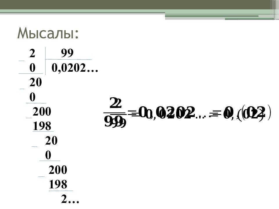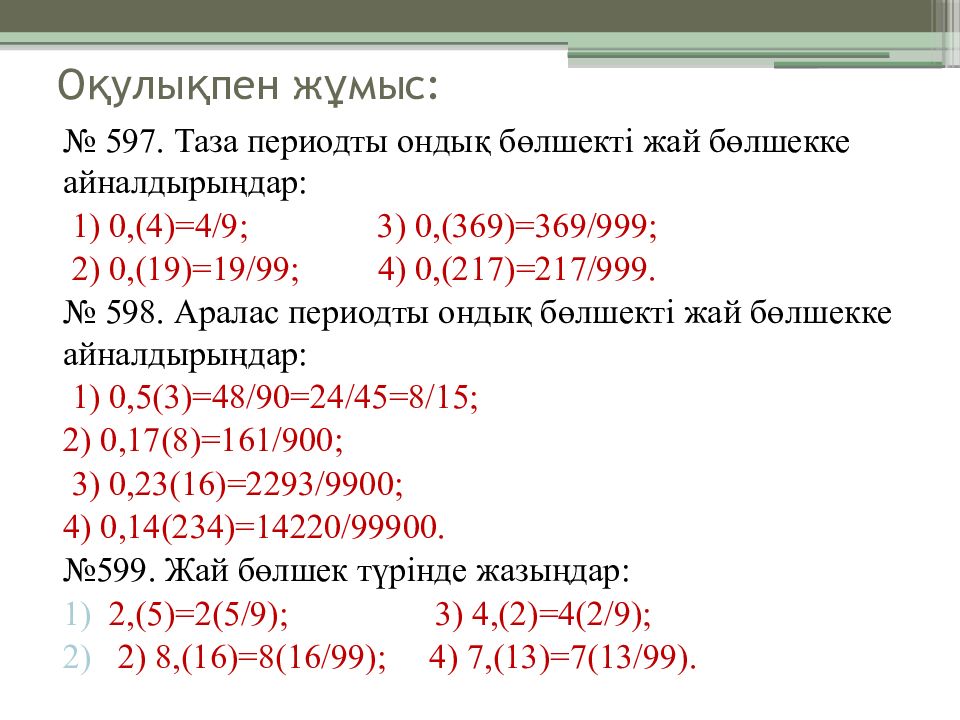 № 597. Таза периодты ондық бөлшекті жай бөлшекке айналдырыңдар : 1) 0,( 4) =4/9 ; 3 ) 0,(369 ) =369/999 ; 2) 0,(19 ) =19/99 ; 4 ) 0,(217 ) =217/999. № 598. Аралас периодты ондық бөлшекті жай бөлшекке айналдырыңдар : 1) 0,5(3 ) =48/90=24/45=8/15 ; 2 ) 0,17(8 ) =161/900 ; 3) 0,23(16 ) =2293/9900 ; 4 ) 0,14(234 ) =14220/99900. №599. Жай бөлшек түрінде жазыңдар: 2,(5 ) =2(5/9) ; 3 ) 4,(2 ) =4(2/9) ; 2) 8,(16 ) =8(16/99) ; 4 ) 7,(13 ) =7(13/99).