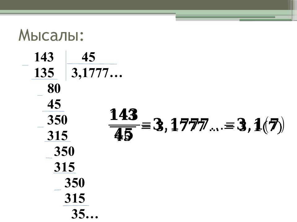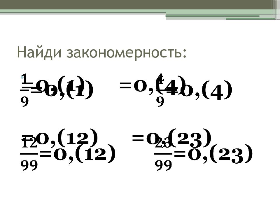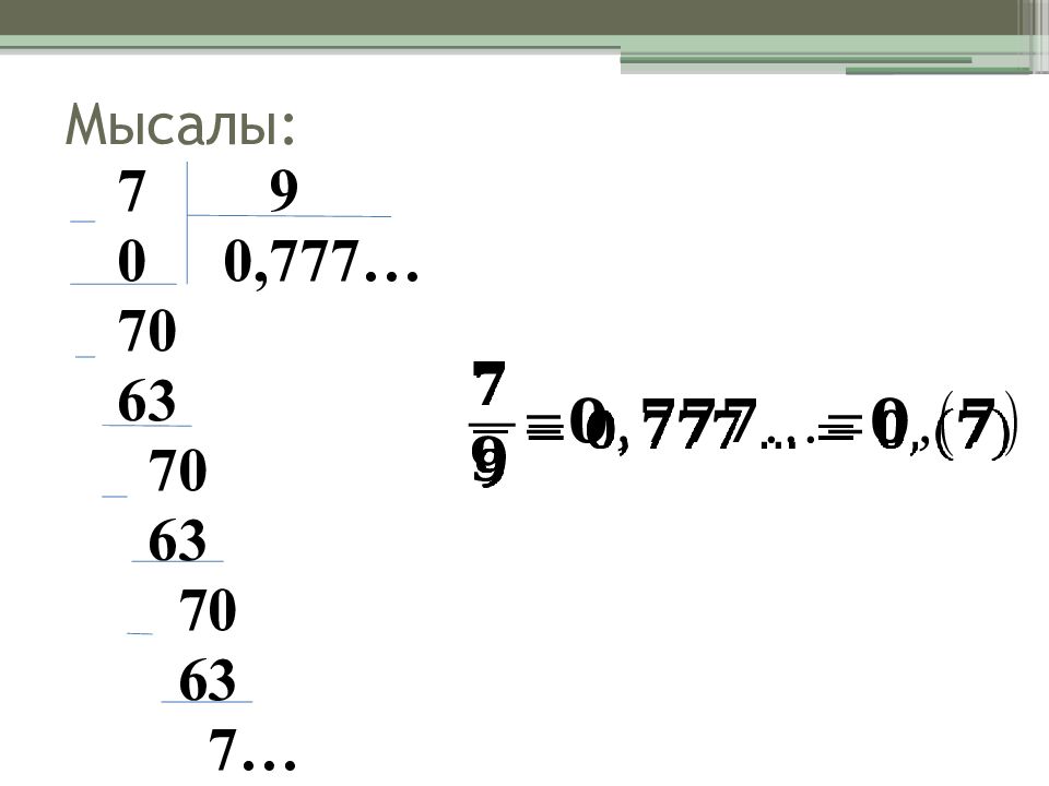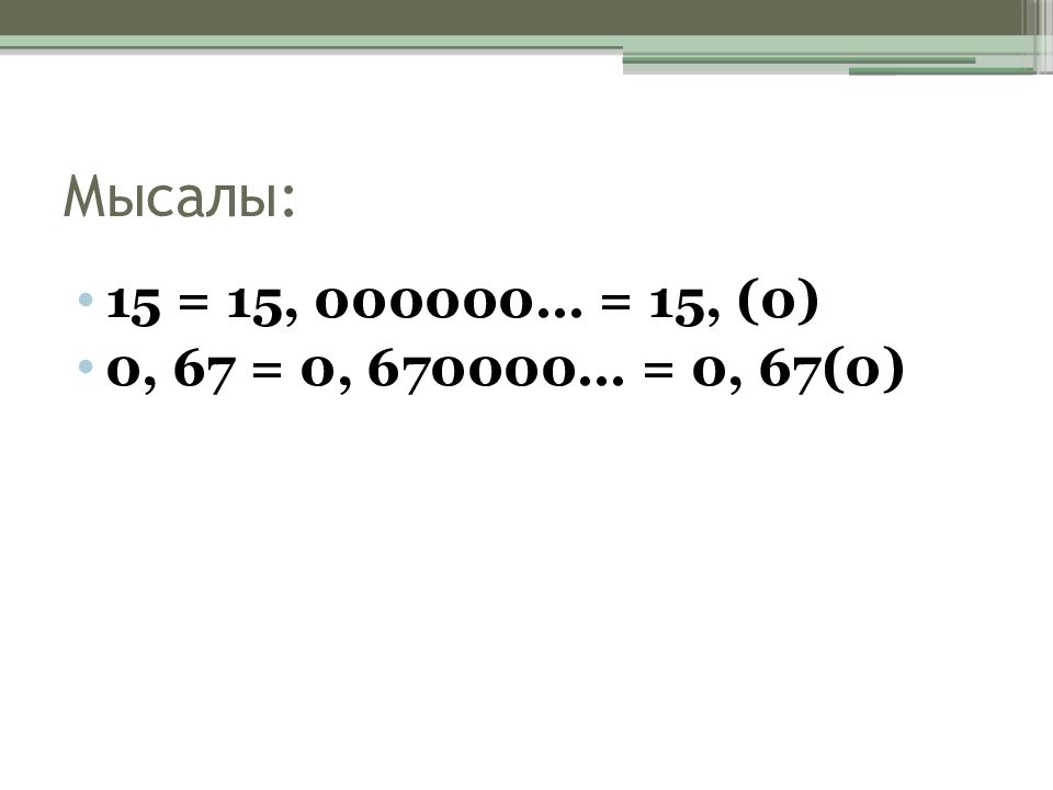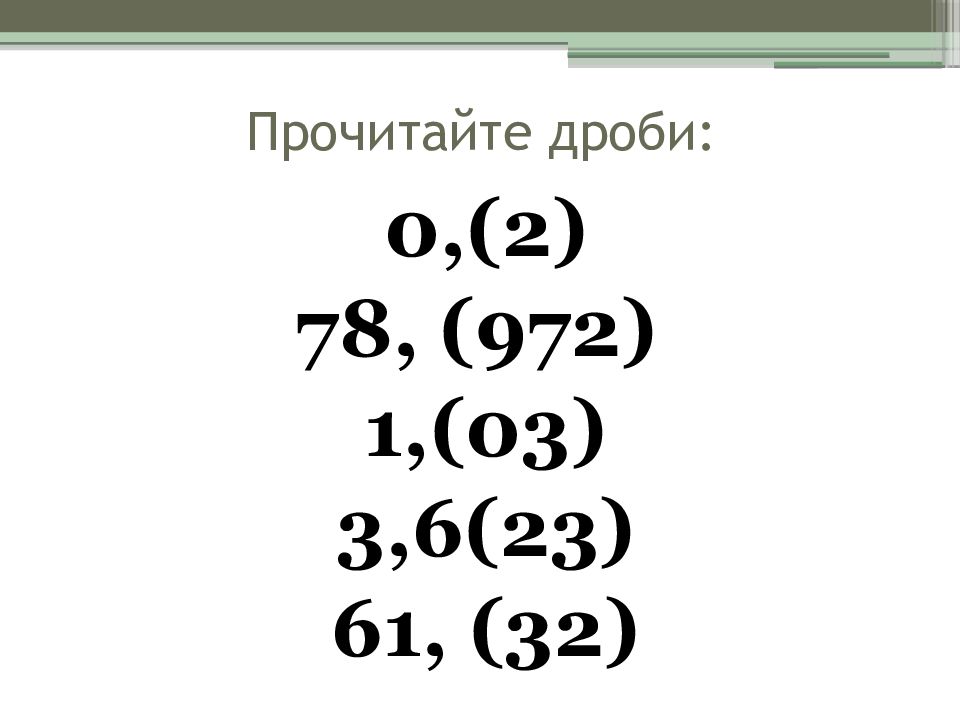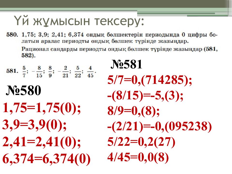 №580 1,75 =1,75(0) ; 3,9=3,9(0); 2,41=2,41(0); 6,374=6,374(0) №581 5/7 =0,( 7 14285); -(8/15)=-5,(3); 8/9=0,(8); -(2/21)=-0,(095238) 5/22=0,2(27) 4/45=0,0(8)