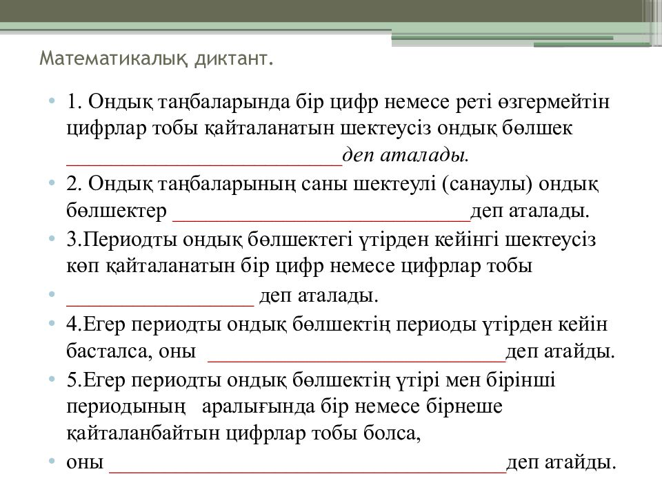 1. Ондық таңбаларында бір цифр немесе реті өзгермейтін цифрлар тобы қайталанатын шектеусіз ондық бөлшек _________________________ деп аталады. 2. Ондық таңбаларының саны шектеулі (санаулы) ондық бөлшектер ___________________________ деп аталады. 3.Периодты ондық бөлшектегі үтірден кейінгі шектеусіз көп қайталанатын бір цифр немесе цифрлар тобы _________________ деп аталады. 4.Егер периодты ондық бөлшектің периоды үтірден кейін басталса, оны ___________________________ деп атайды. 5.Егер периодты ондық бөлшектің үтірі мен бірінші периодының аралығында бір немесе бірнеше қайталанбайтын цифрлар тобы болса, оны ____________________________________ деп атайды.