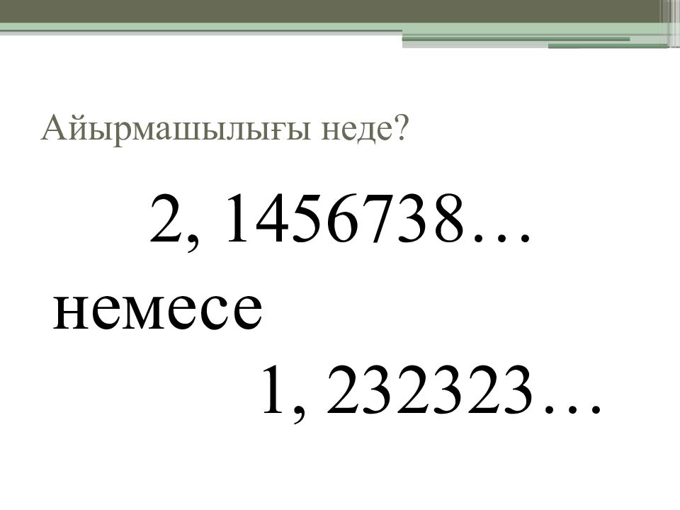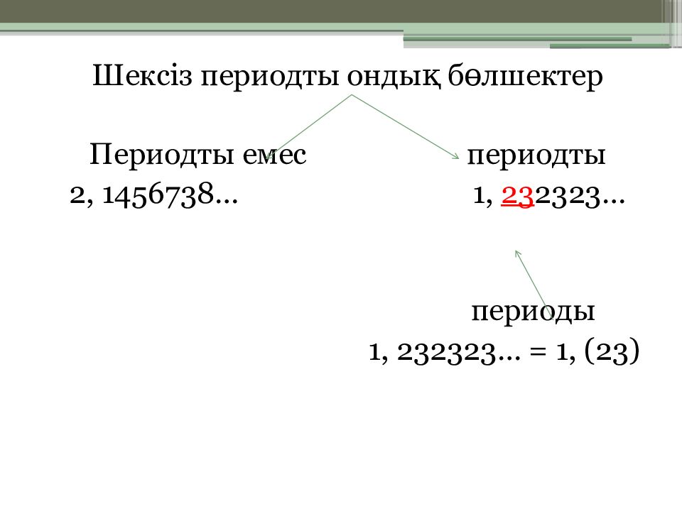 Шексіз периодты ондық бөлшектер Периодты емес периодты 2, 1456738… 1, 23 2323… периоды 1, 232323… = 1, (23)
