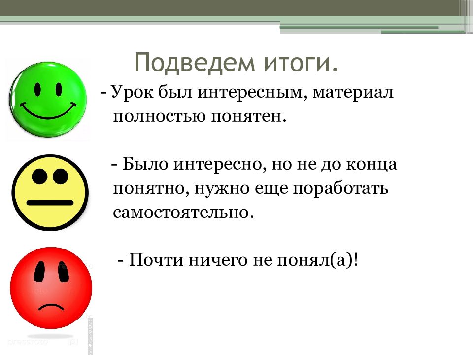 - Урок был интересным, материал полностью понятен. - - Было интересно, но не до конца понятно, нужно еще поработать самостоятельно. - Почти ничего не понял(а)!