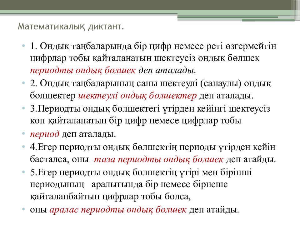 1. Ондық таңбаларында бір цифр немесе реті өзгермейтін цифрлар тобы қайталанатын шектеусіз ондық бөлшек периодты ондық бөлшек деп аталады. 2. Ондық таңбаларының саны шектеулі (санаулы) ондық бөлшектер шектеулі ондық бөлшектер деп аталады. 3.Периодты ондық бөлшектегі үтірден кейінгі шектеусіз көп қайталанатын бір цифр немесе цифрлар тобы период деп аталады. 4.Егер периодты ондық бөлшектің периоды үтірден кейін басталса, оны таза периодты ондық бөлшек деп атайды. 5.Егер периодты ондық бөлшектің үтірі мен бірінші периодының аралығында бір немесе бірнеше қайталанбайтын цифрлар тобы болса, оны аралас периодты ондық бөлшек деп атайды.