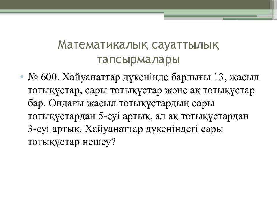 № 600. Хайуанаттар дүкенінде барлығы 13, жасыл тотықұстар, сары тотықұстар және ақ тотықұстар бар. Ондағы жасыл тотықұстардың сары тотықұстардан 5-еуі артық, ал ақ тотықұстардан 3-еуі артық. Хайуанаттар дүкеніндегі сары тотықұстар нешеу ?