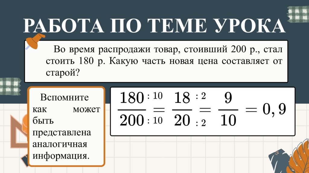 РАБОТА ПО ТЕМЕ УРОКА Во время распродажи товар, стоивший 200 р., стал стоить 180 р. Какую часть новая цена составляет от старой ? Почему такие записи не встречаются в магазинах ? Вспомните как может быть представлена аналогичная информация.
