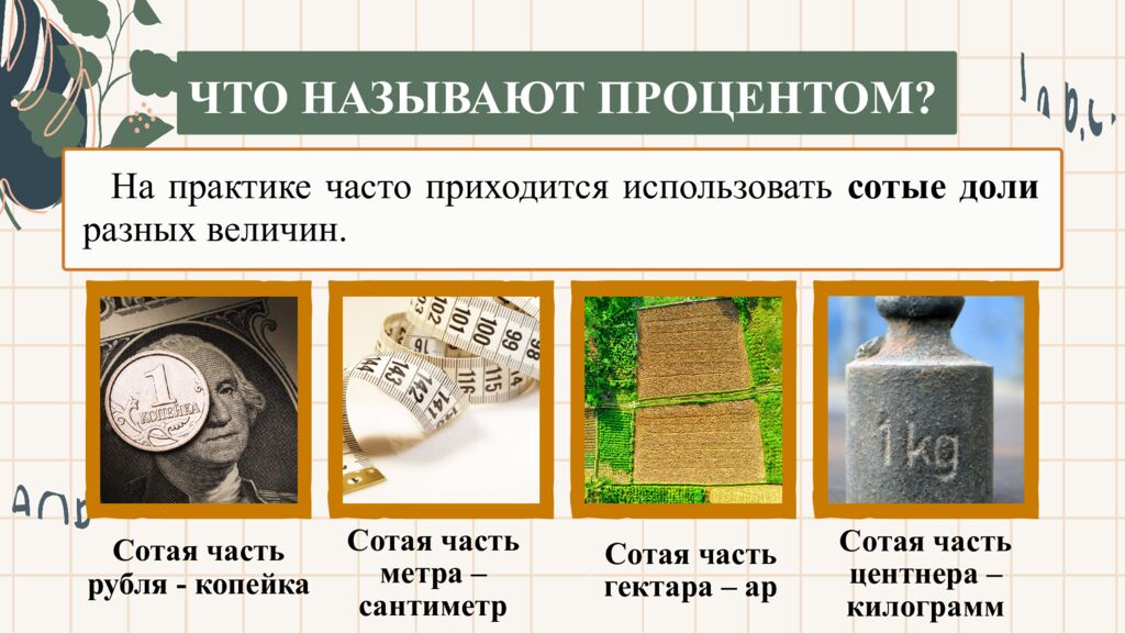 ЧТО НАЗЫВАЮТ ПРОЦЕНТОМ? На практике часто приходится использовать сотые доли разных величин. Сотая часть метра – сантиметр Сотая часть рубля - копейка Сотая часть гектара – ар Сотая часть центнера – килограмм