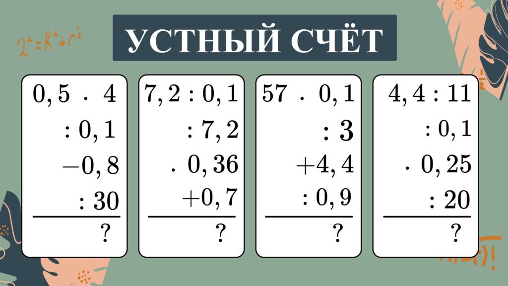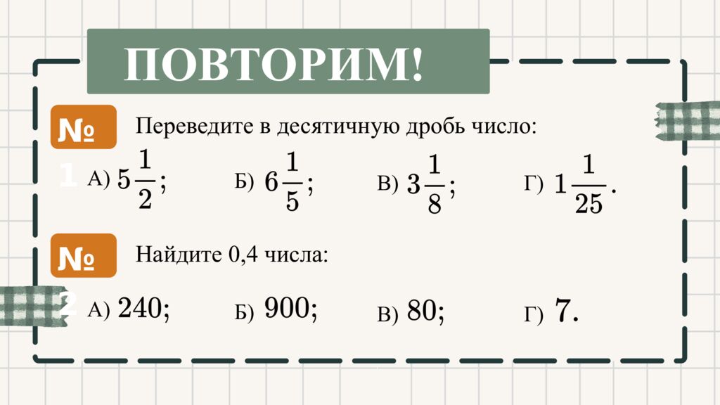 А) Б) Г) ПОВТОРИМ! Переведите в десятичную дробь число : В) № 1 Найдите 0,4 числа: № 2 А) Б) Г) В)