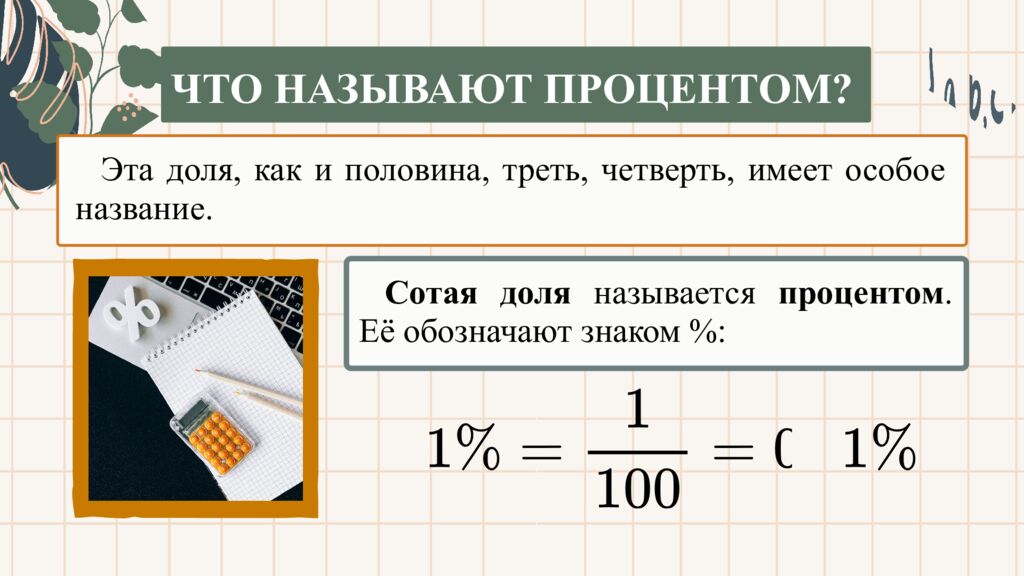 ЧТО НАЗЫВАЮТ ПРОЦЕНТОМ? Эта доля, как и половина, треть, четверть, имеет особое название. Сотая доля называется процентом. Её обозначают знаком %: