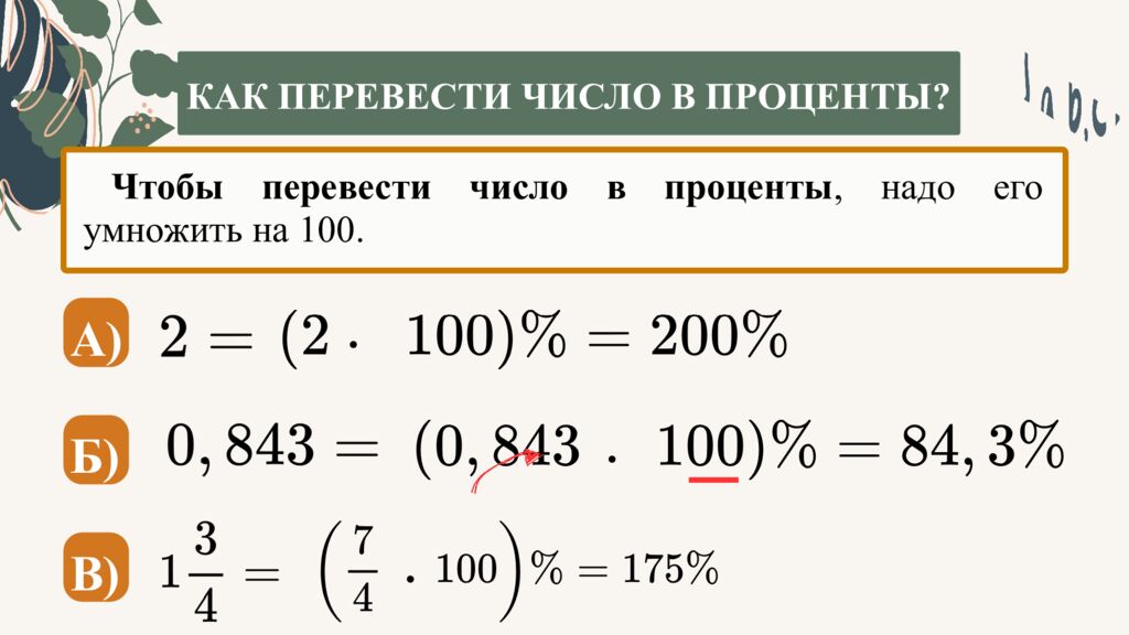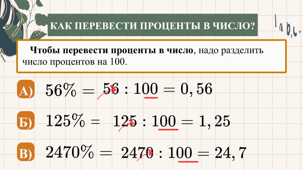 КАК ПЕРЕВЕСТИ ПРОЦЕНТЫ В ЧИСЛО? Чтобы перевести проценты в число, надо разделить число процентов на 100. А) Б) В)