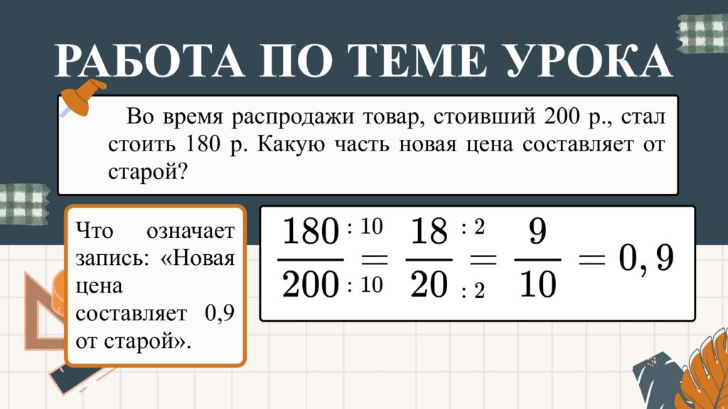 РАБОТА ПО ТЕМЕ УРОКА Во время распродажи товар, стоивший 200 р., стал стоить 180 р. Какую часть новая цена составляет от старой ? Что означает запись : « Новая цена составляет 0,9 от старой ».