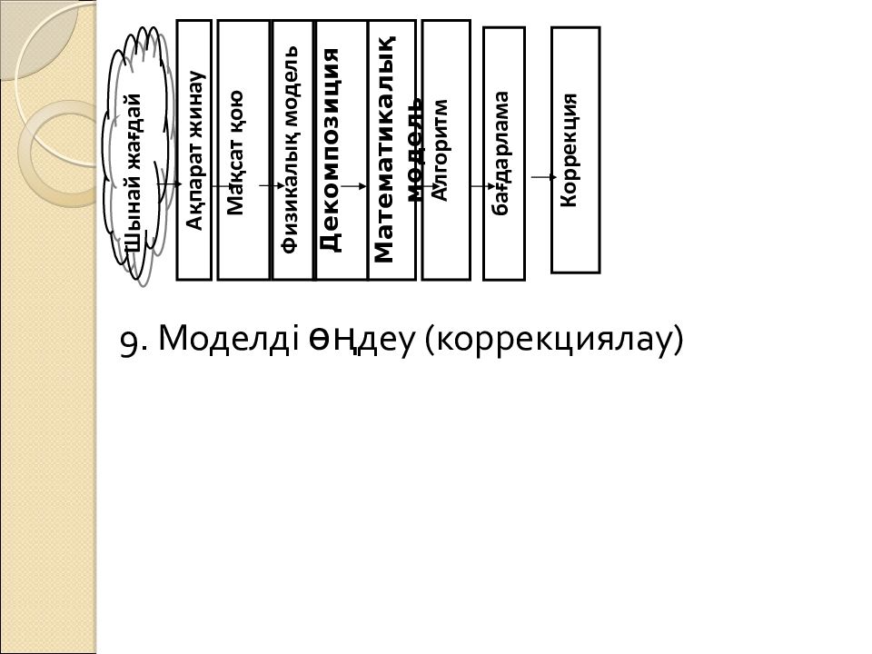 9. Моделді өңдеу (коррекциялау) Коррекция бағдарлама Шынай жағдай Ақпарат жинау Мақсат қою Физикалық модель Декомпозиция Математи калық модель Алгоритм