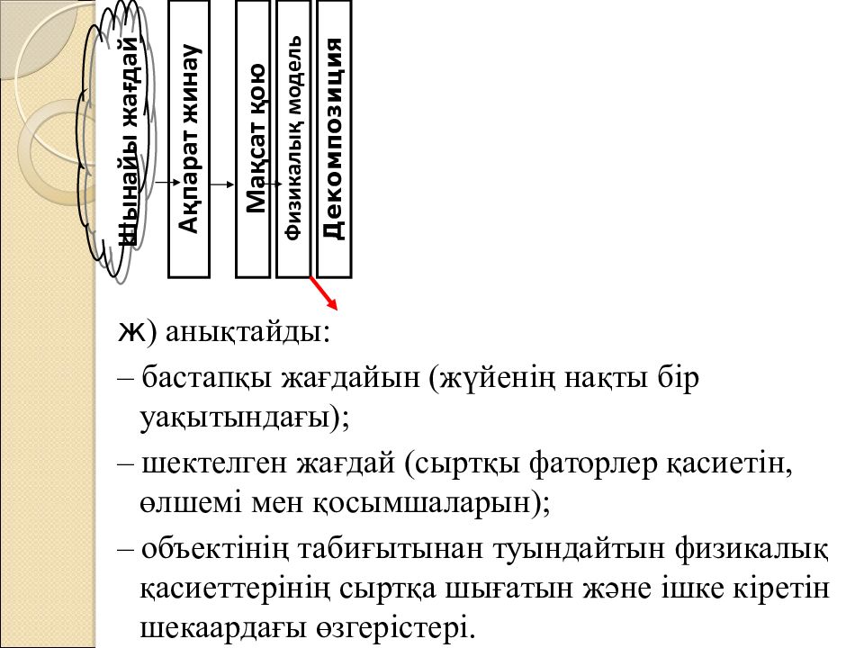 ж ) анықтайды : – бастапқы жағдайын (жүйенің нақты бір уақытындағы ); – шектелген жағдай (сыртқы фаторлер қасиетін, өлшемі мен қосымшаларын ); – объектінің табиғытынан туындайтын физикалық қасиеттерінің сыртқа шығатын және ішке кіретін шекаардағы өзгерістері. Шынайы жағдай Ақпарат жинау Мақсат қою Физикалық модель Декомпозиция