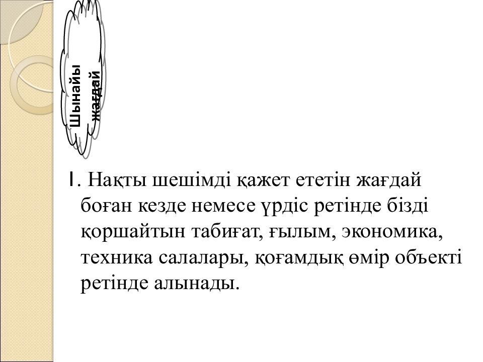 1. Нақты шешімді қажет ететін жағдай боған кезде немесе үрдіс ретінде бізді қоршайтын табиғат, ғылым, экономика, техника салалары, қоғамдық өмір объекті ретінде алынады. Шынайы жағдай