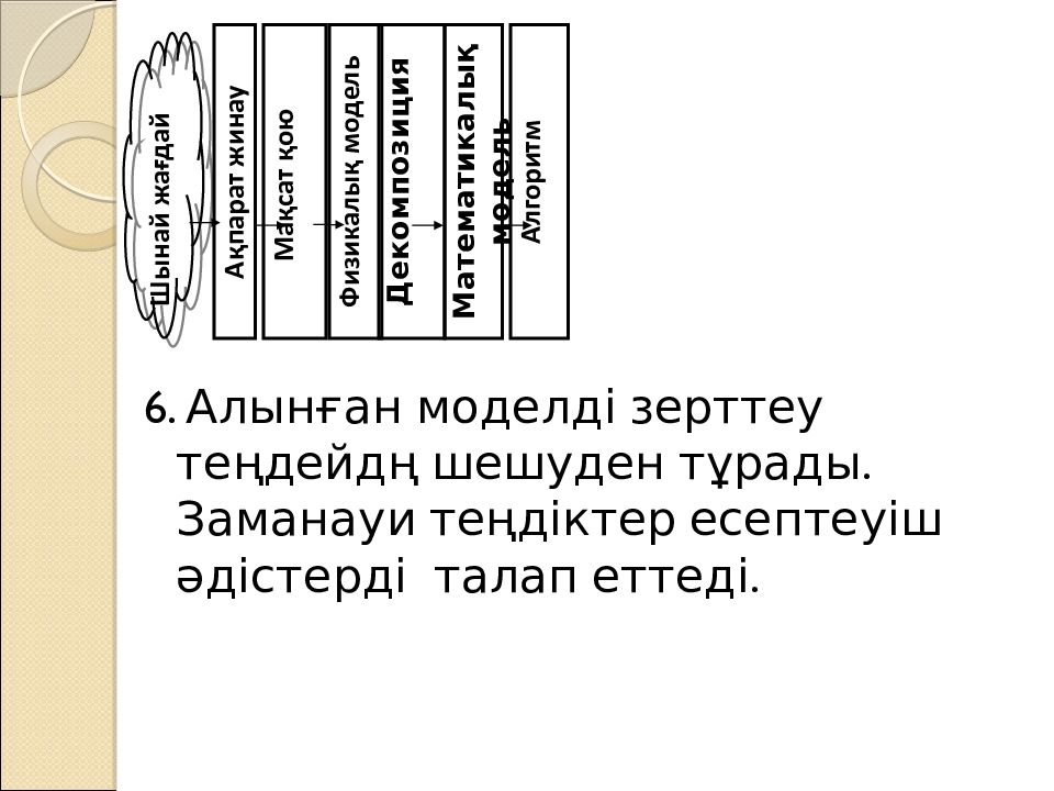 6. Алынған моделді зерттеу теңдейдң шешуден тұрады. Заманауи теңдіктер есептеуіш әдістерді талап еттеді. Шынай жағдай Ақпарат жинау Мақсат қою Физикалық модель Декомпозиция Математи калық модель Алгоритм