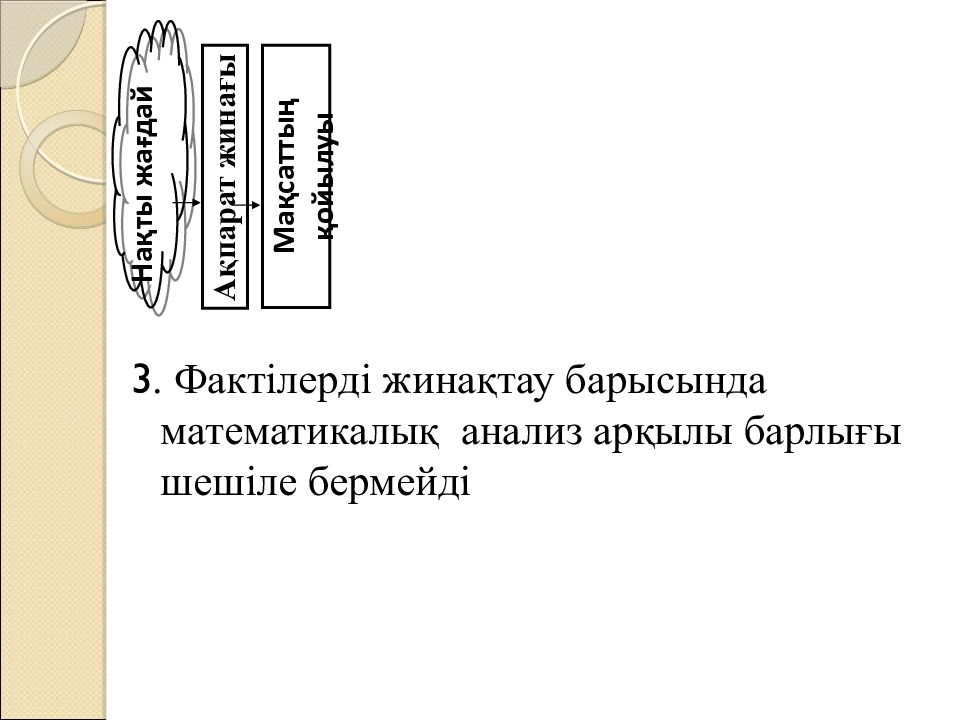 3. Фактілерді жинақтау барысында математикалық анализ арқылы барлығы шешіле бермейді Нақты жағдай Ақпарат жинағы Мақсаттың қойылуы