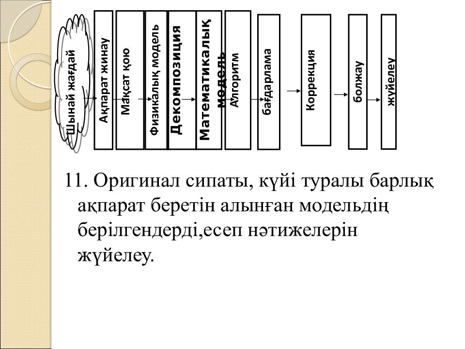 жүйелеу 11. Оригинал сипаты, күйі туралы барлық ақпарат беретін алынған модельдің берілгендерді,есеп нәтижелерін жүйелеу. Коррекция болжау бағдарлама Шынай жағдай Ақпарат жинау Мақсат қою Физикалық модель Декомпозиция Математи калық модель Алгоритм