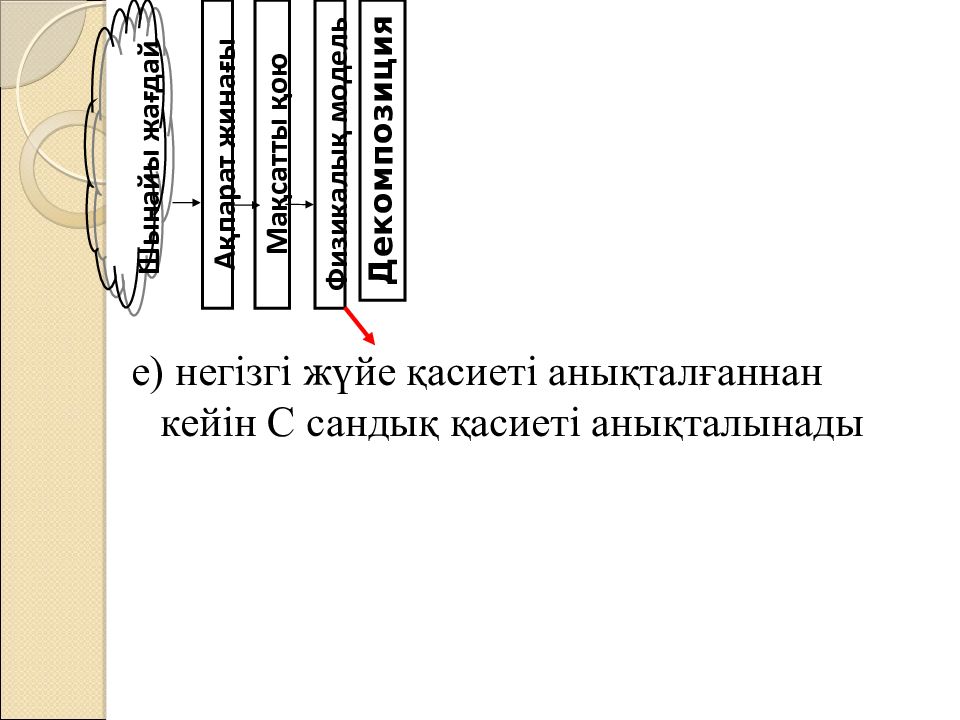 е) негізгі жүйе қасиеті анықталғаннан кейін С сандық қасиеті анықталынады Шынайы жағдай Ақпарат жинағы Мақсатты қою Физикалық модель Декомпозиция