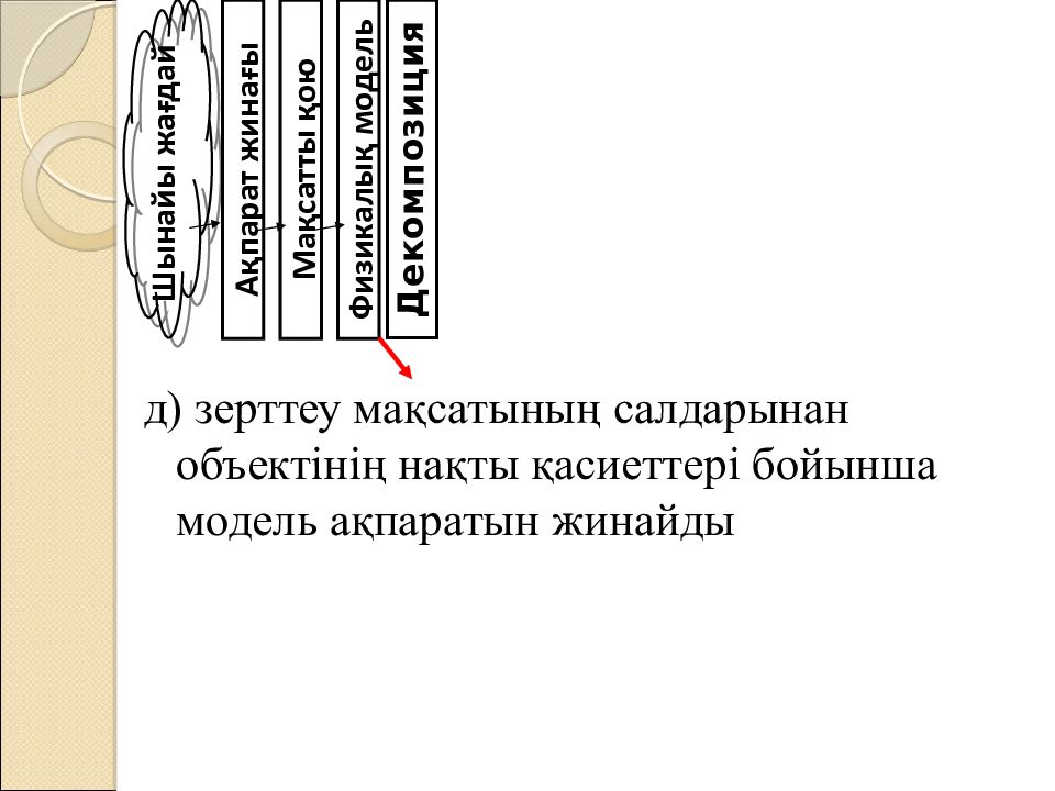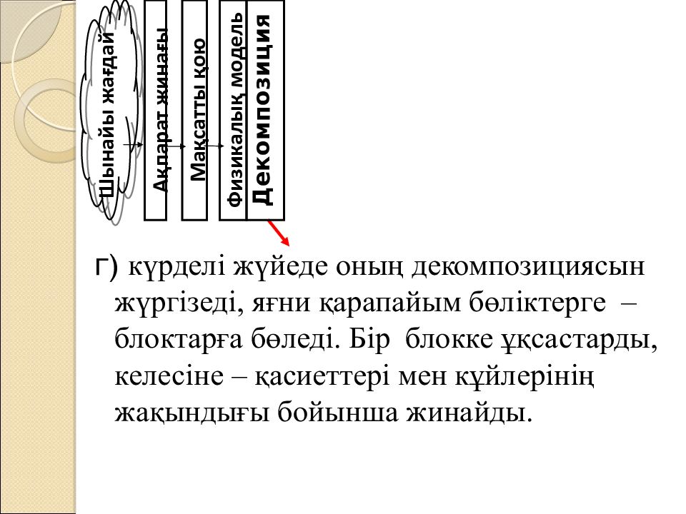 г) күрделі жүйеде оның декомпозициясын жүргізеді, яғни қарапайым бөліктерге – блоктарға бөледі. Бір блокке ұқсастарды, келесіне – қасиеттері мен кұйлерінің жақындығы бойынша жинайды. Шынайы жағдай Ақпарат жинағы Мақсатты қою Физикалық модель Декомпозиция