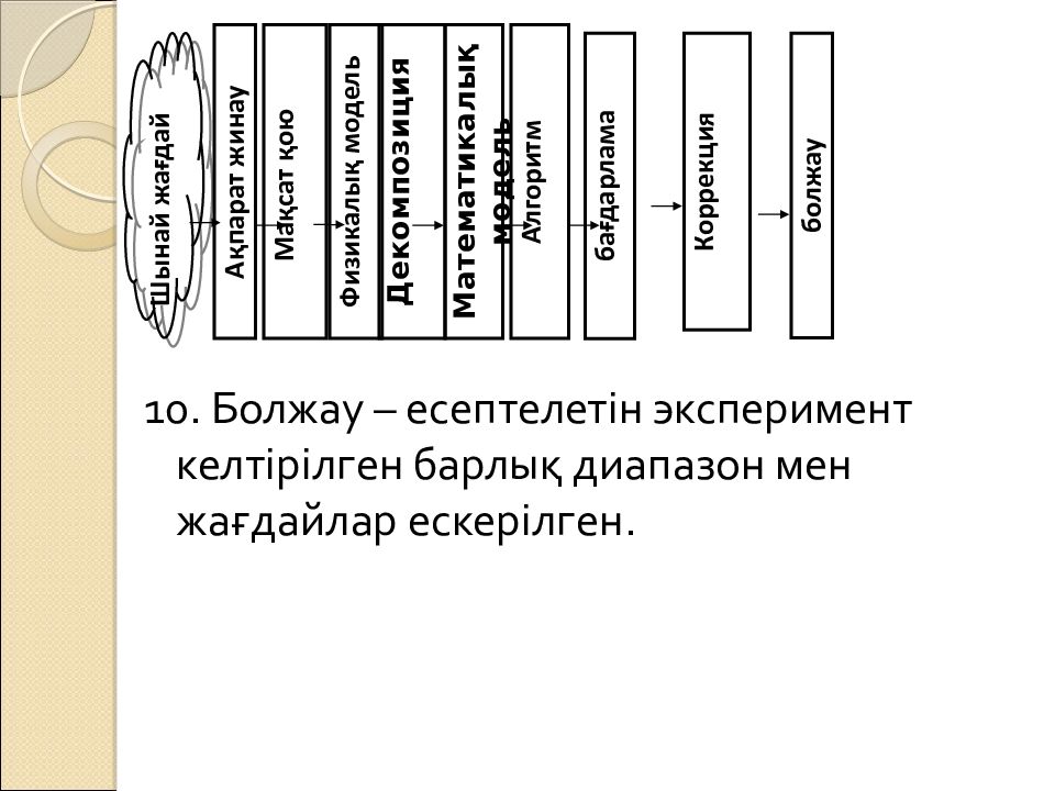 10. Болжау – есептелетін эксперимент келтірілген барлық диапазон мен жағдайлар ескерілген. Коррекция болжау бағдарлама Шынай жағдай Ақпарат жинау Мақсат қою Физикалық модель Декомпозиция Математи калық модель Алгоритм