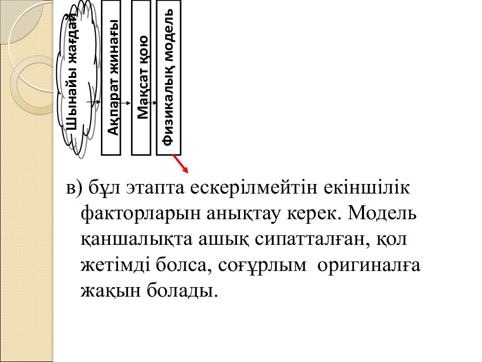 в) бұл этапта ескерілмейтін екіншілік факторларын анықтау керек. Модель қаншалықта ашық сипатталған, қол жетімді болса, соғұрлым оригиналға жақын болады. Шынайы жағдай Ақпарат жинағы Мақсат қою Физи калық модель