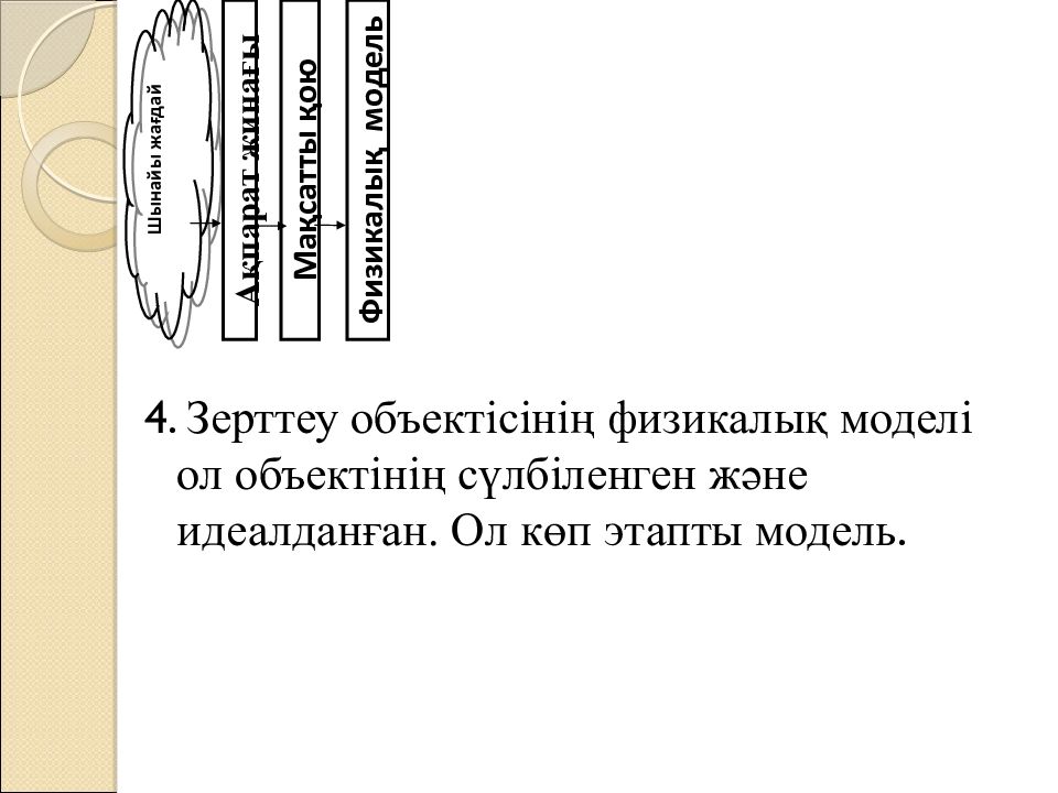 4. Зерттеу объектісінің физикалық моделі ол объектінің сүлбіленген және идеалданған. Ол көп этапты модель. Шынайы жағдай Ақпарат жинағы Мақсатты қою Физи калық модель