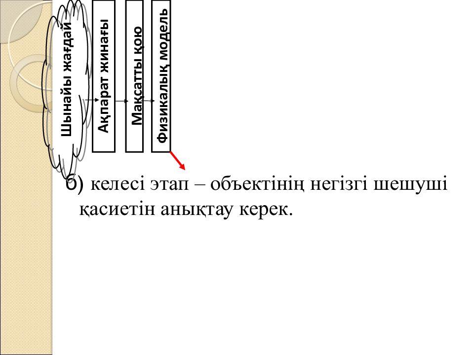 б) келесі этап – объектінің негізгі шеш у ші қасиетін анықтау керек. Шынайы жағдай Ақпарат жинағы Мақсатты қою Физи калық модель