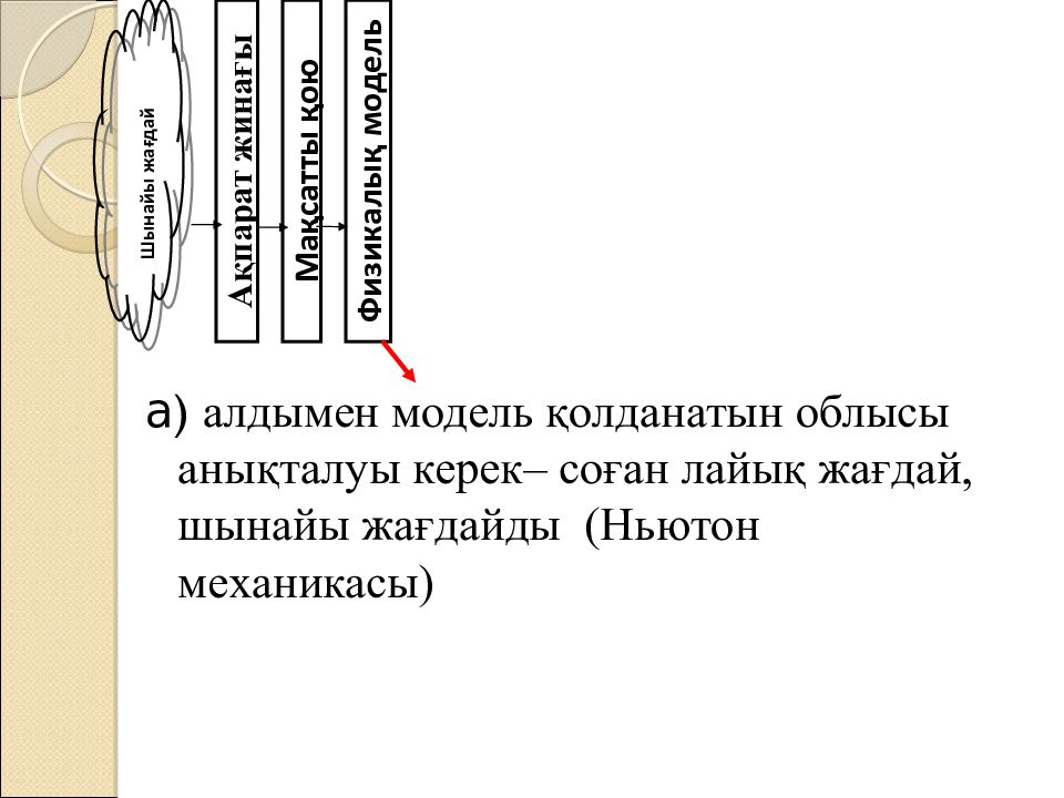 а) алдымен модель қолданатын облысы анықталуы керек– соған лайық жағдай, шынайы жағдайды (Ньютон механикасы) Шынайы жағдай Ақпарат жинағы Мақсатты қою Физи калық модель