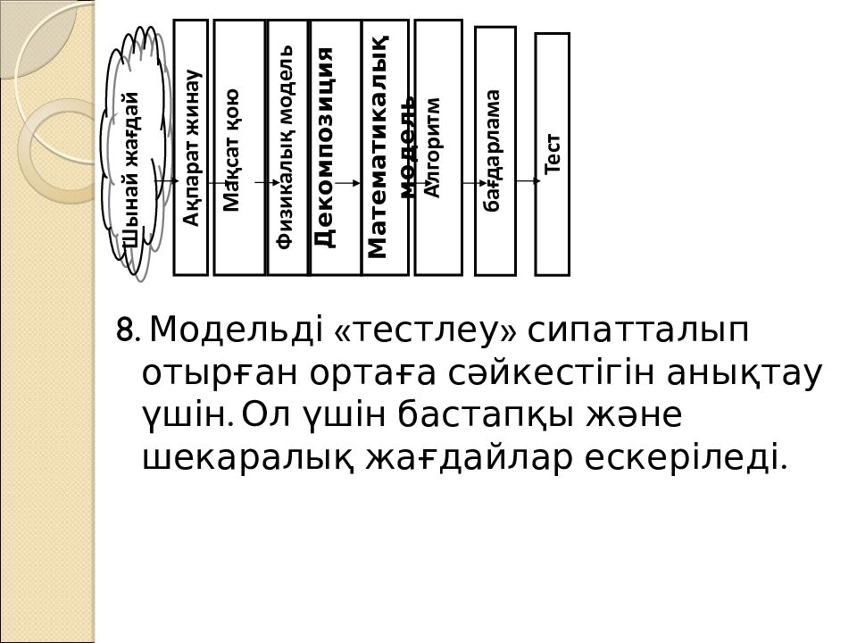 8. Модельді « тестлеу » сипатталып отырған ортаға сәйкестігін анықтау үшін. Ол үшін бастапқы және шекаралық жағдайлар ескеріледі. Тест бағдарлама Шынай жағдай Ақпарат жинау Мақсат қою Физикалық модель Декомпозиция Математи калық модель Алгоритм