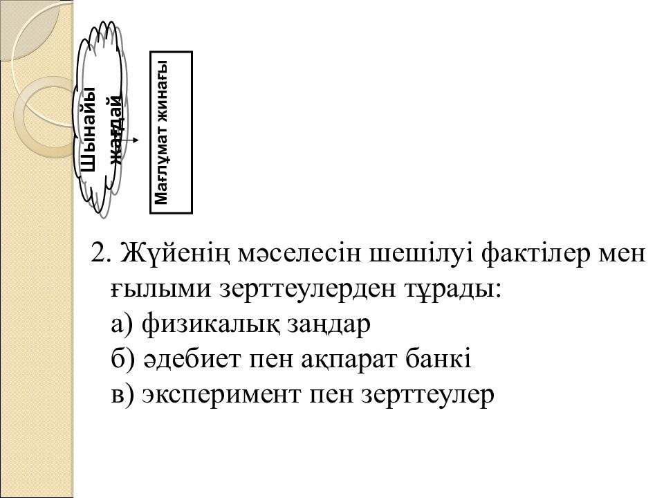 2. Жүйенің мәселесін шешілуі фактілер мен ғылыми зерттеулерден тұрады: а) физикалық заңдар б) әдебиет пен ақпарат банкі в) эксперимент пен зерттеулер Шынайы жағдай Мағлұмат жинағы