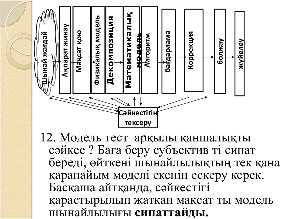 12. Модель тест арқылы қаншалықты сәйкес ? Баға беру субъектив ті сипат береді, өйткені шынайлылықтың тек қана қарапайым моделі екенін ескеру керек. Басқаша айтқанда, сәйкестігі қарастырылып жатқан мақсат ты модель шынайлылығы сипаттайды. Сәйкестігін тексеру жүйелеу Коррекция болжау бағдарлама Шынай жағдай Ақпарат жинау Мақсат қою Физикалық модель Декомпозиция Математи калық модель Алгоритм