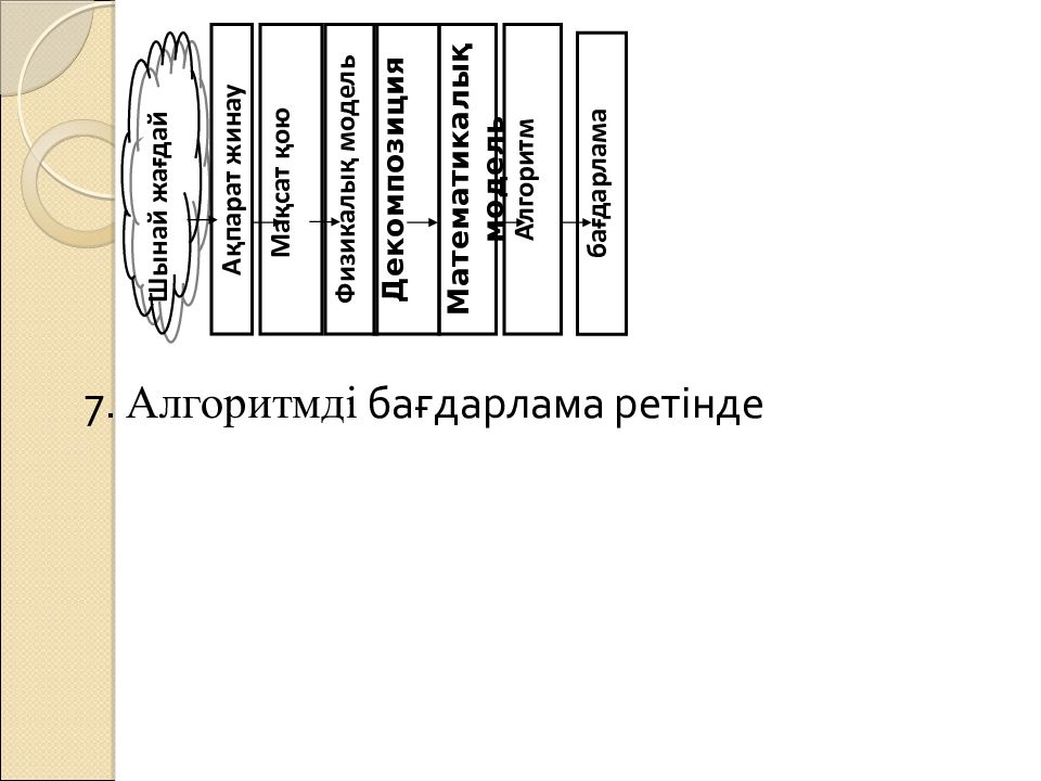 7. Алгоритмді бағдарлама ретінде бағдарлама Шынай жағдай Ақпарат жинау Мақсат қою Физикалық модель Декомпозиция Математи калық модель Алгоритм