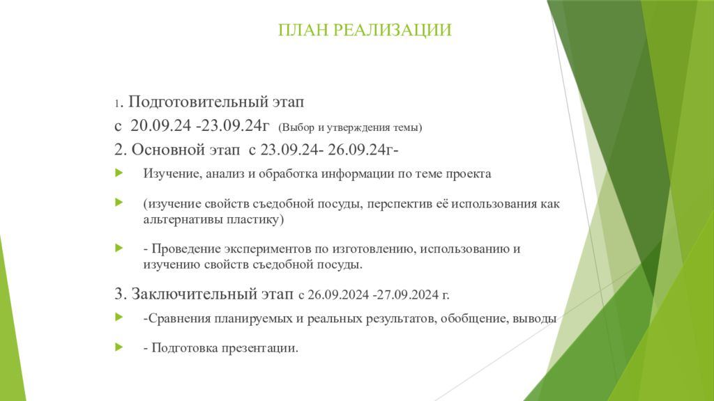1. Подготовительный этап с 20.09.24 -23.09.24г (Выбор и утверждения темы) 2. Основной этап с 23.09.24- 26.09.24г - Изучение, анализ и обработка информации по теме проекта (изучение свойств съедобной посуды, перспектив её использования как альтернативы пластику) - Проведение экспериментов по изготовлению, использованию и изучению свойств съедобной посуды. 3. Заключительный этап с 26.09.2024 -27.09.2024 г. -Сравнения планируемых и реальных результатов, обобщение, выводы - Подготовка презентации.
