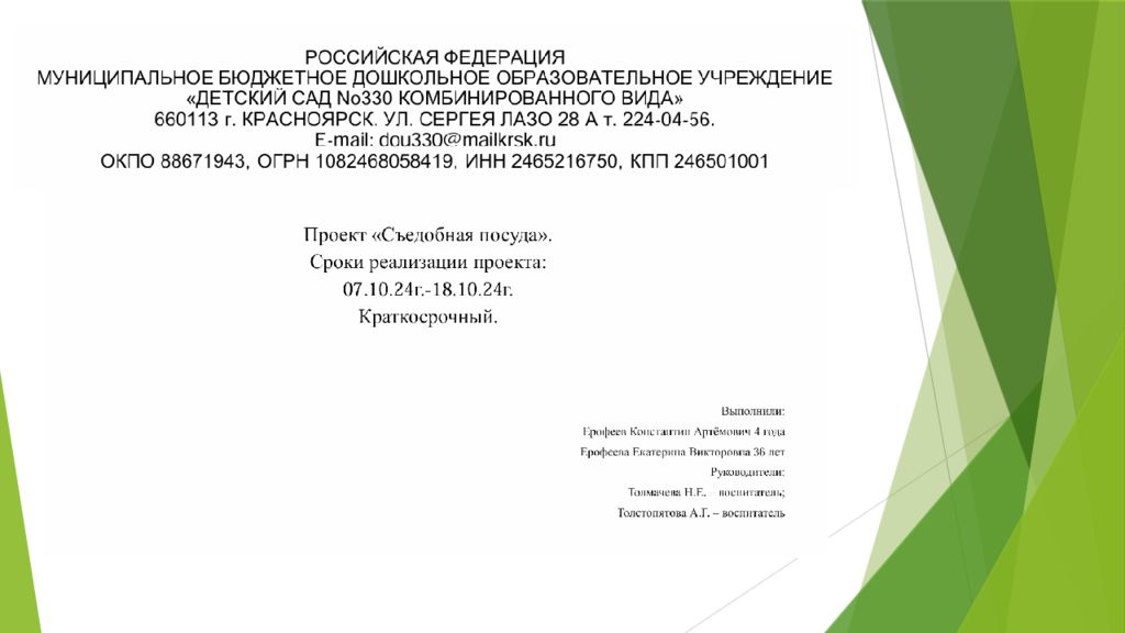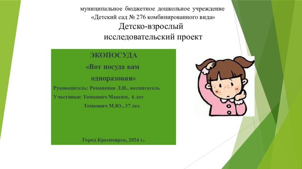 ЭКОПОСУДА «Вот посуда вам одноразовая» Руководитель: Романенко Л.И., воспитатель Участники: Томкович Максим, 6 лет Томкович М.Ю., 37 лет. Город Красноярск, 2024 г.