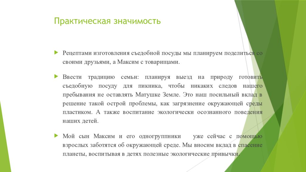 Рецептами изготовления съедобной посуды мы планируем поделиться со своими друзьями, а Максим с товарищами. Ввести традицию семьи: планируя выезд на природу готовить съедобную посуду для пикника, чтобы никаких следов нашего пребывания не оставлять Матушке Земле. Это наш посильный вклад в решение такой острой проблемы, как загрязнение окружающей среды пластиком. А также воспитание экологически осознанного поведения наших детей. Мой сын Максим и его одногруппники уже сейчас с помощью взрослых заботятся об окружающей среде. Мы вносим вклад в спасение планеты, воспитывая в детях полезные экологические привычки.